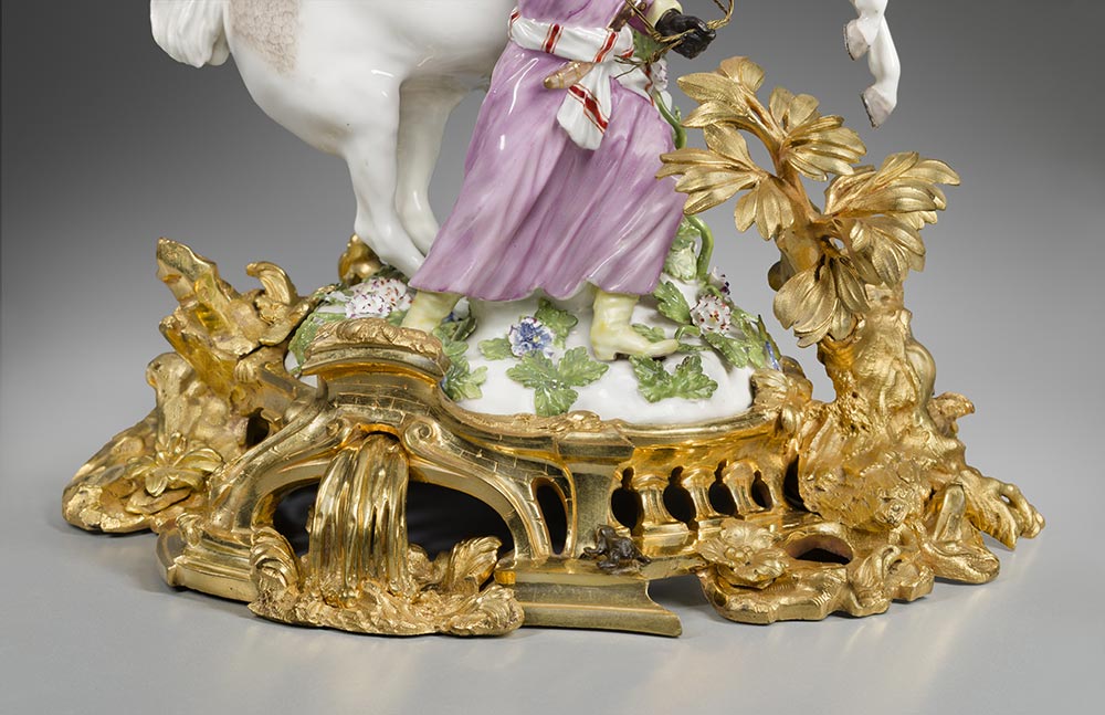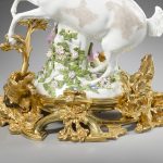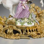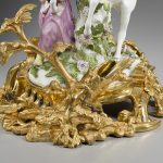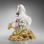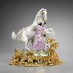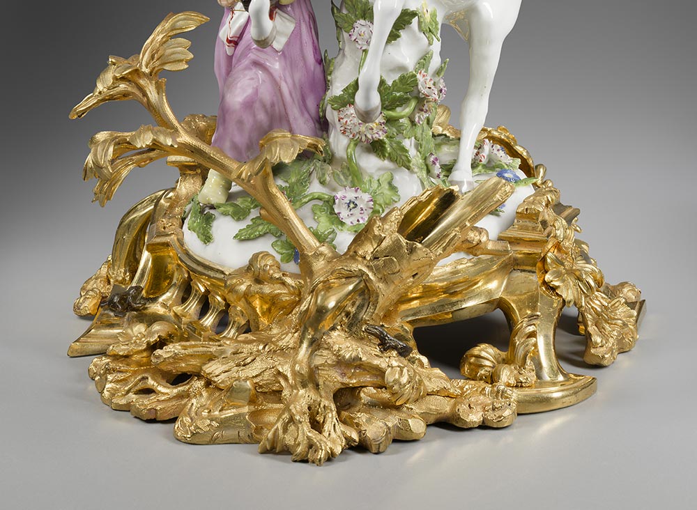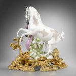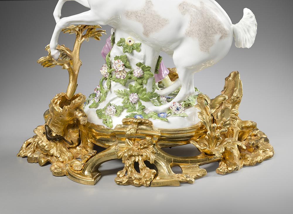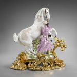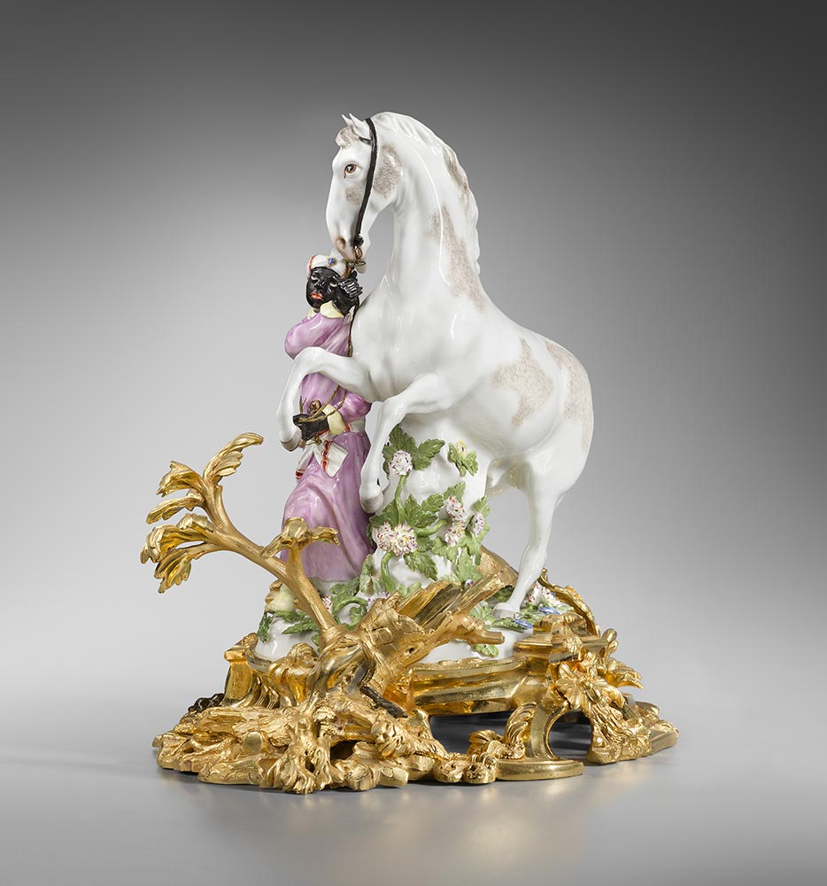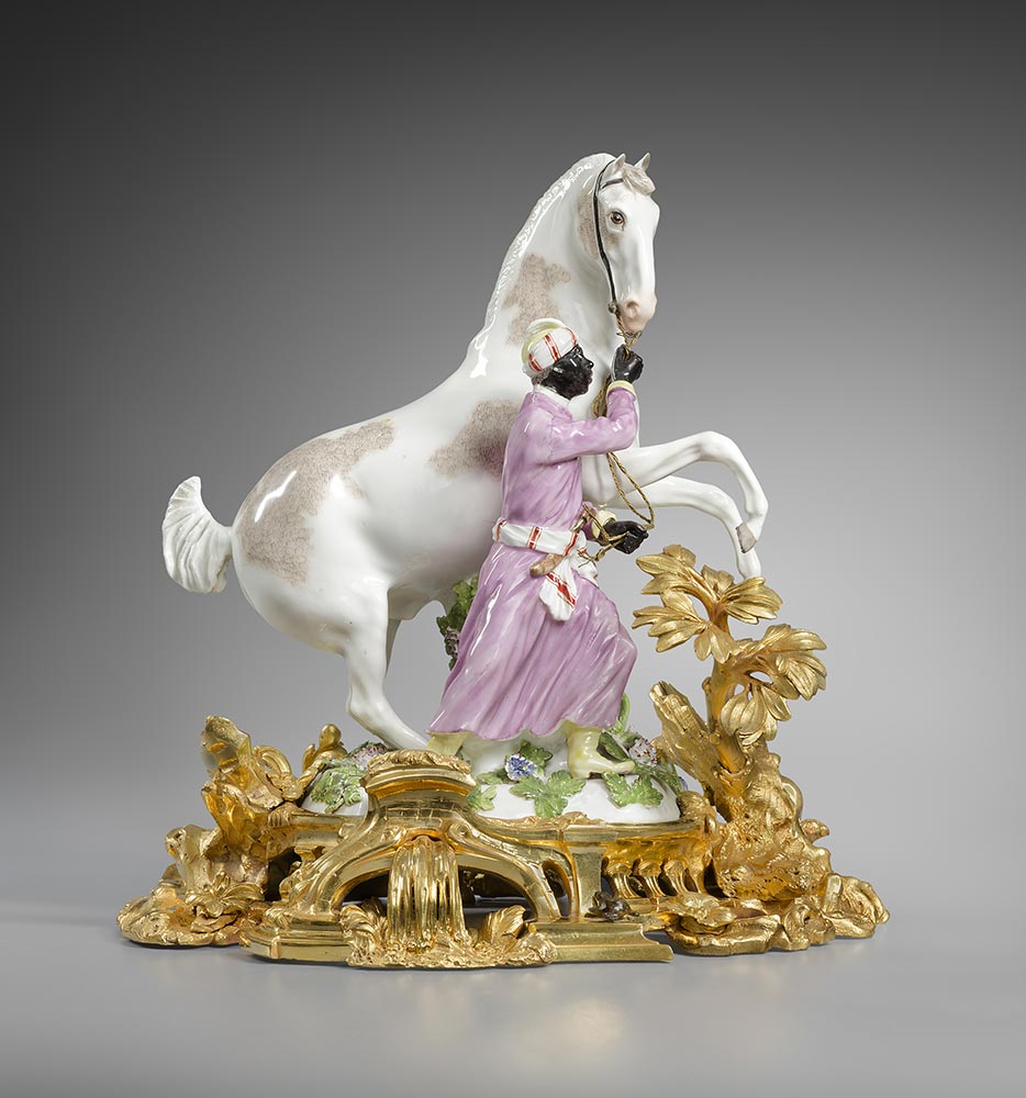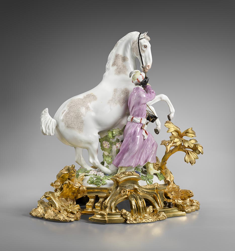 Un groupeen porcelaine de Meissen d’après le modèle de Johann Joachim Kaendler, représentant un palefrenier tenant par une bride un cheval cabré, monté sur une terrasse rocaille avec cascade et palmier enbronze doré, ornée d’une grenouille et d’un lézard en bronze patiné d’époque Louis XV – vers 1750