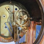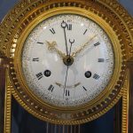 Cadran en émail, avec les chiffres Romains pour les heures et Arabes pour les quarts et l’indication du quantième. Aiguilles en laiton gravées et dorées, mouvement rond, échappement à chevilles, suspension à couteau du balancier gril, sonnerie au passage des heures et des demies avec roue de compte sur la platine arrière.