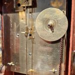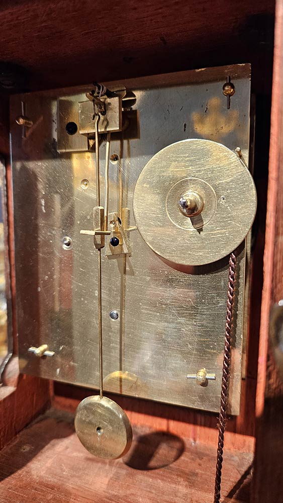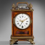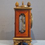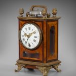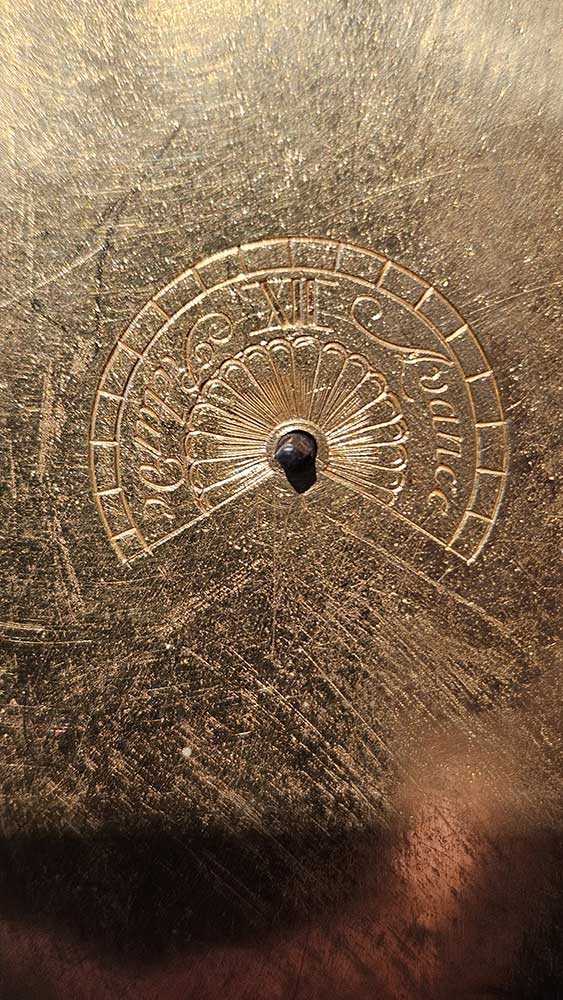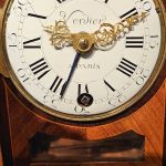 Cadran en émail portant la signature, avec les chiffres Romains pour les heures et Arabes pour les minutes. Aiguilles en laiton, découpées, gravées et dorées. Aiguille du réveil en acier bleui. Armage du réveil par tirage. Mouvement rectangulaire, échappement à ancre à recul, suspension à fil du balancier et sonnerie du réveil sur timbre.
