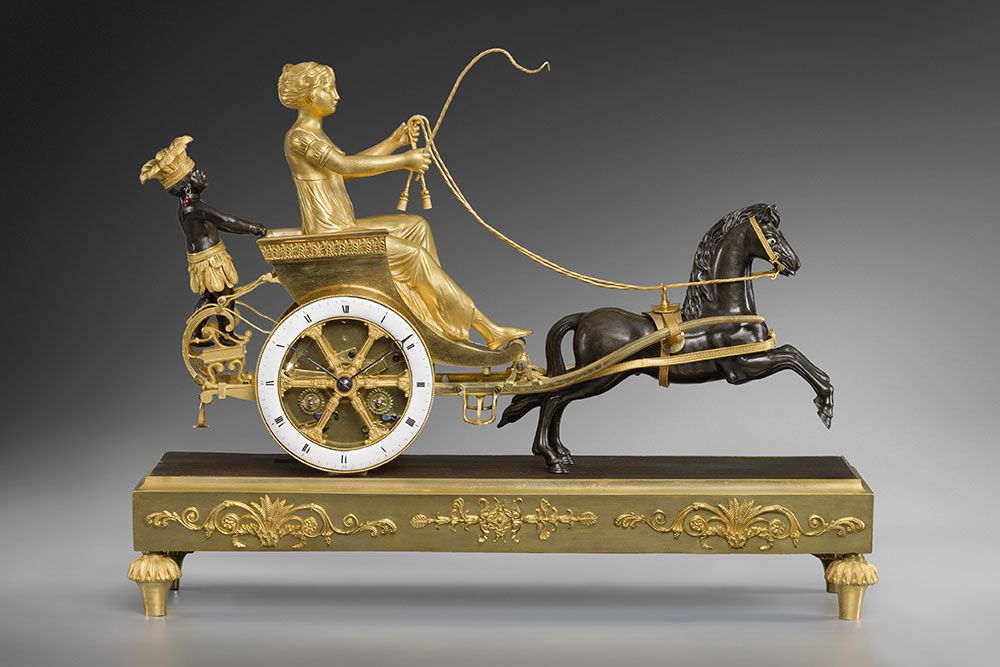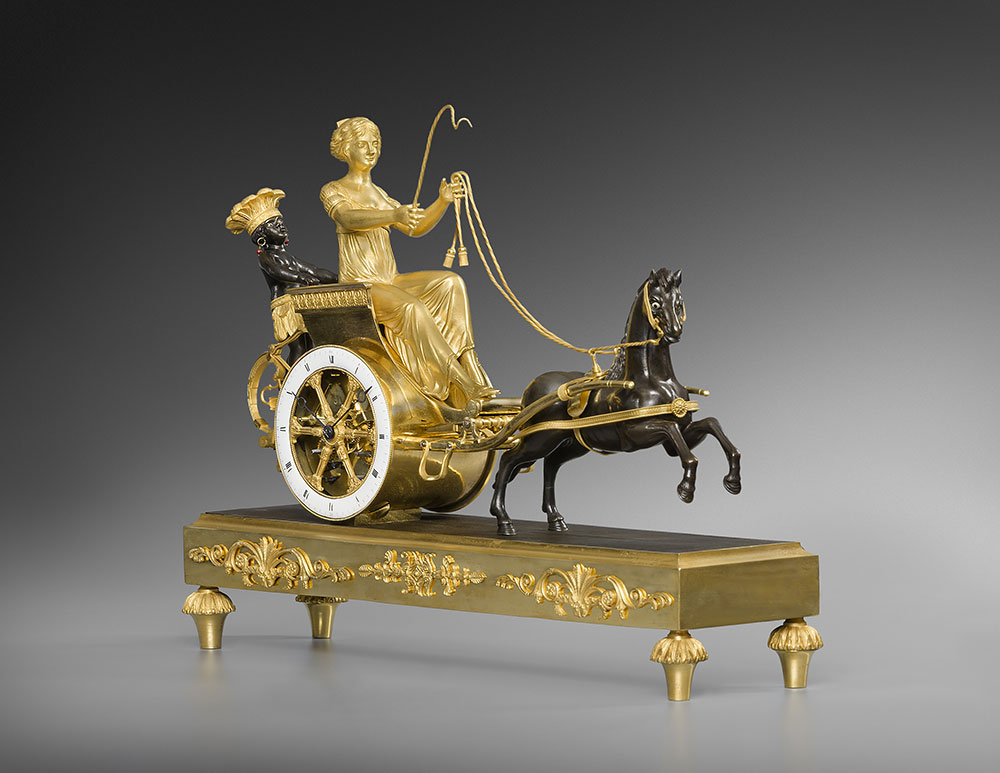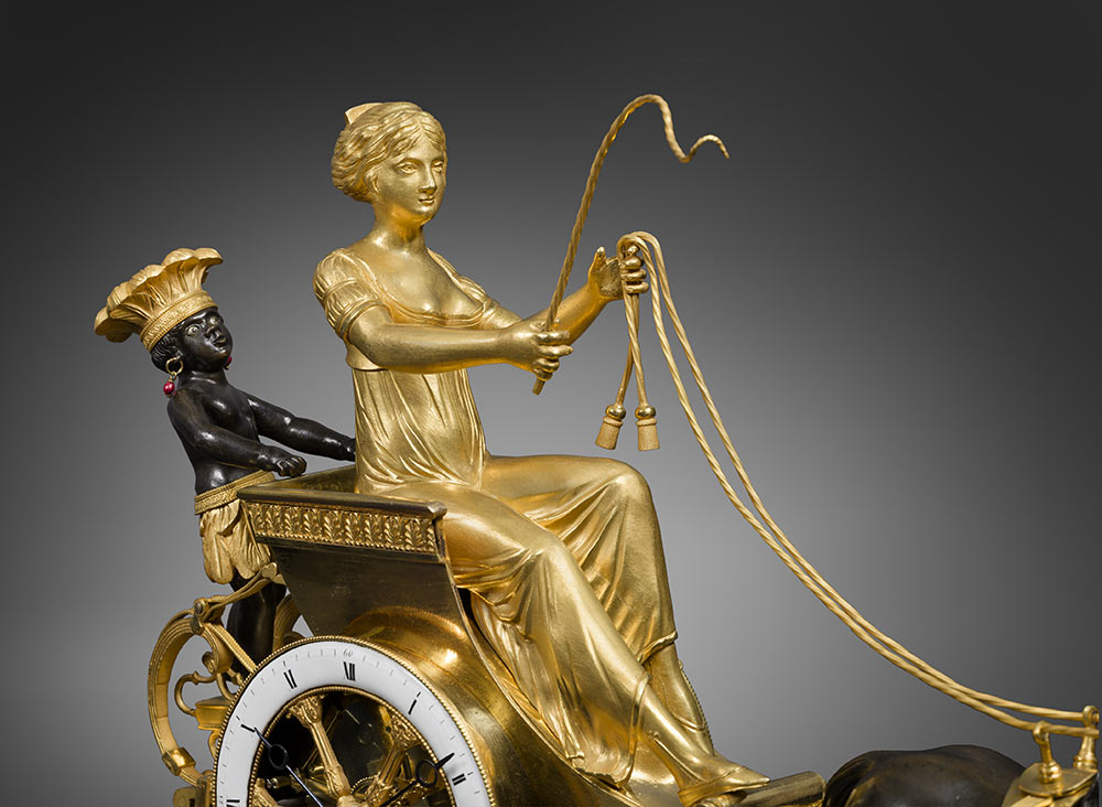 Une pendule en bronze ciselé, doré et patiné, représentant une jeune femme de la Louisiane assise dans un char rentrant des plantations