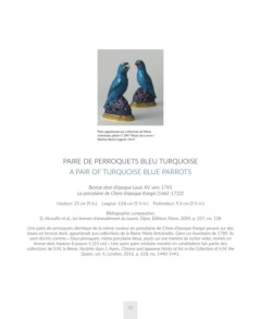 sont décrits comme « Deux perroquets, même porcelaine bleue, posés sur une manière de rocher violet, montés en